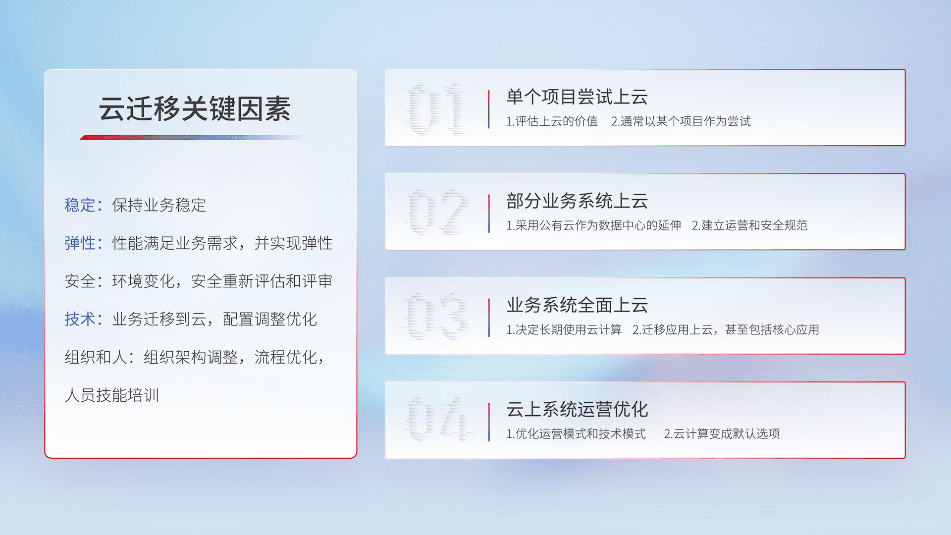 结合实际业务,,,,从规划设计、、、云平台选型、、、云原生改造、、数据迁移、、、、集成交付,,,迁移全过程为客户识别最佳上云路径,,,,做好风险识别管理,,设计网络架构、、身份权限、、安全审计合规、、、操作审计、、、、日志审计、、、、监控告警策略、、多站点容灾设计等,,,对云上基础设施进行整体规划,,提升IT治理水平,,以满足弹性、、、、高可用、、高性能的需求。。。。
