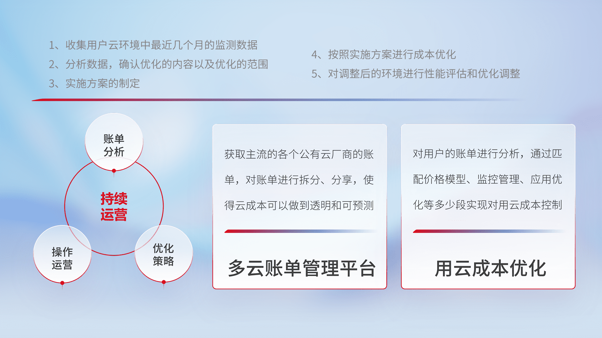 通过多云纳管,,以统一的资源数据模型把客户的云资源进行抽象和封装,,,,进而实现对多云资源的统一操作,,保障云资源管理的可靠性、、、稳定性与可用性。。量身定制化运维内容,,,配置、、、开发运维、、、补丁管理、、、备份、、、、监控、、、认证和访问管理、、审计和日常巡检等,,,保障在用云过程中的可靠度,,,稳定度以及高可用率。。。。