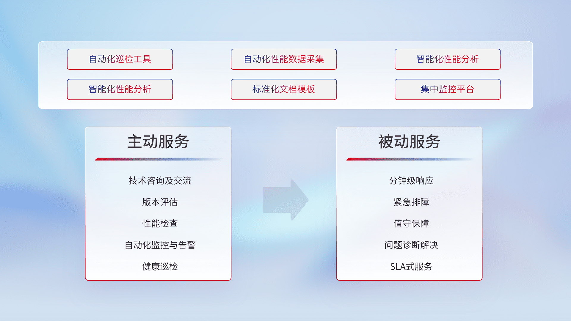 智能化工具和标准化文档,,保障服务质量,,,,提供主动服务(包含技术咨询、、、、版本评估、、、、性能检查、、、、自动化监控与告警、、、、健康巡检)和被动服务包含(分钟级响应、、、、紧急排障、、值守保障、、、问题诊断解决、、、SLA服务)。。